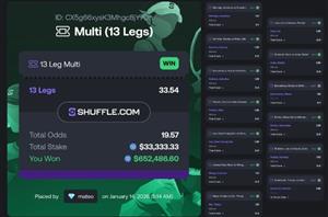 A Shuffle bettor wagered $33K on a 13-leg tennis multi during the Australian Open and was rewarded with a $652K payout after 11 wins and 2 voids.